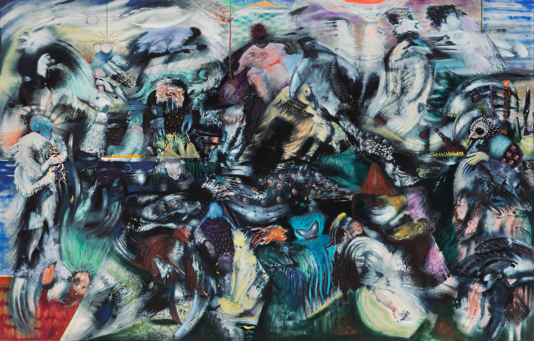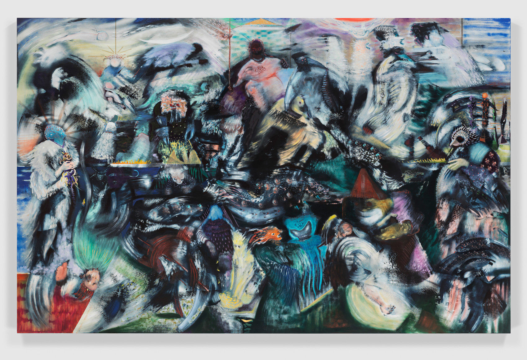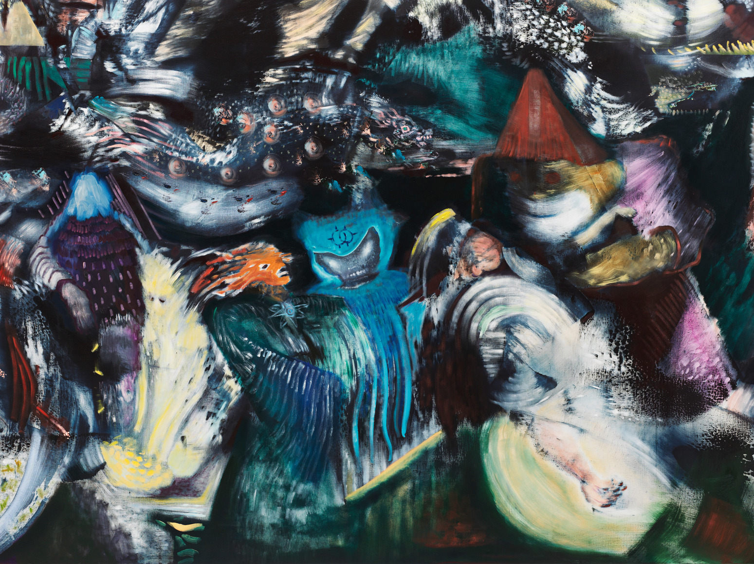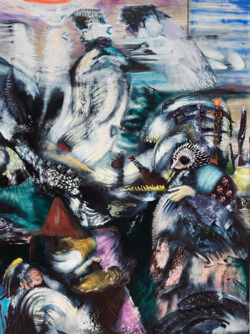In The Fortune Teller (2024), Banisadr uses geometry, a new compositional device for him, to divide the painting into discrete areas. There are two different-sized, overlapping pyramids rising from the bottom edge. The apex of a small yellow one touches the middle of the painting’s top edge. Painted a color found nowhere else in the painting, it becomes a mysterious sign, whose meaning we cannot decipher. Is it a sign of hope, a message, or a structure seen in the distance? On either side of the yellow pyramid, linear elements descend from the top edge, dividing the sky into separate zones. Located in the upper right-hand corner, the blue and white streaked, irregular rectangle works in counterpoint to the hubbub taking place in the rest of the painting. Everything in The Fortune Teller seems to be rising up in defiance of gravity.