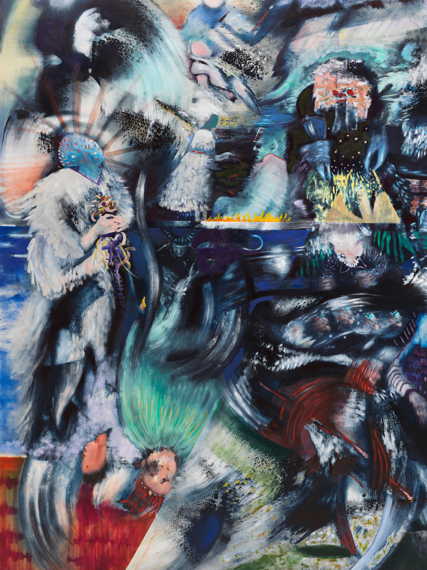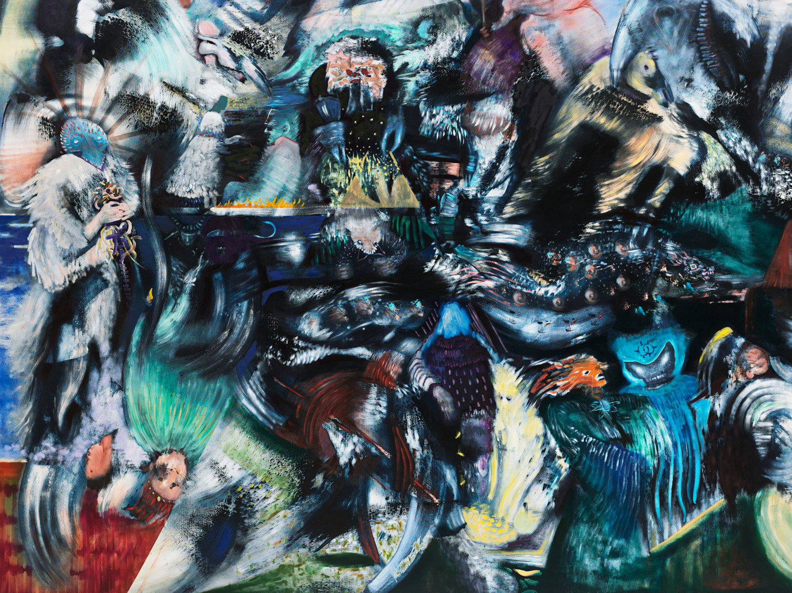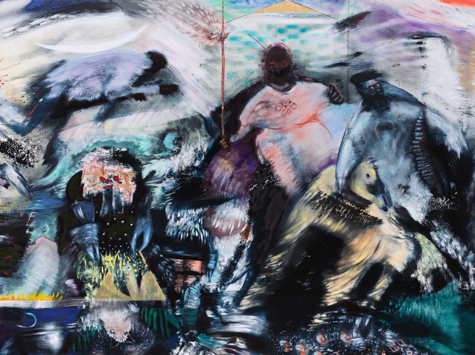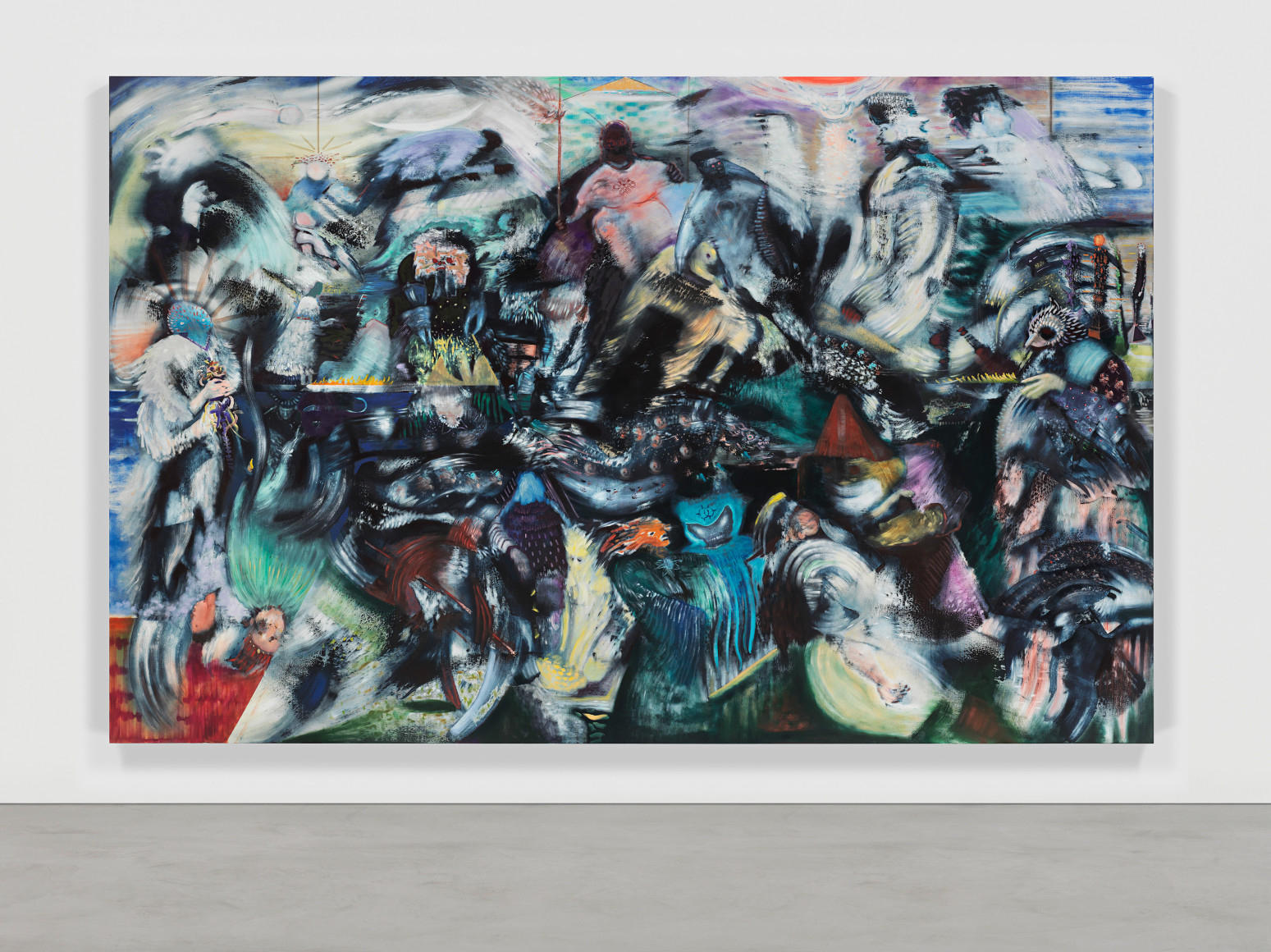 In The Fortune Teller (2024), Banisadr uses geometry, a new compositional device for him, to divide the painting into discrete areas. There are two different-sized, overlapping pyramids rising from the bottom edge. The apex of a small yellow one touches the middle of the painting’s top edge. Painted a color found nowhere else in the painting, it becomes a mysterious sign, whose meaning we cannot decipher. Is it a sign of hope, a message, or a structure seen in the distance? On either side of the yellow pyramid, linear elements descend from the top edge, dividing the sky into separate zones. Located in the upper right-hand corner, the blue and white streaked, irregular rectangle works in counterpoint to the hubbub taking place in the rest of the painting. Everything in The Fortune Teller seems to be rising up in defiance of gravity.