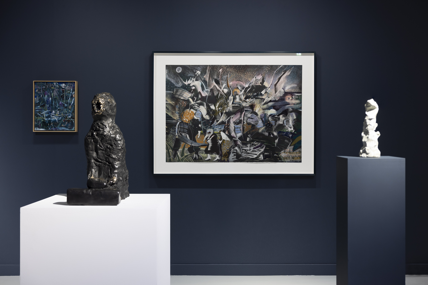 Most of the works in the exhibition are nocturnal where moons rise over winter landscapes; figures gather in forests; storms churn unseen. Night, for Banisadr, is not the absence of vision but a condition in which transformation becomes possible—where consciousness loosens, symbols migrate, and latent structures surface.
