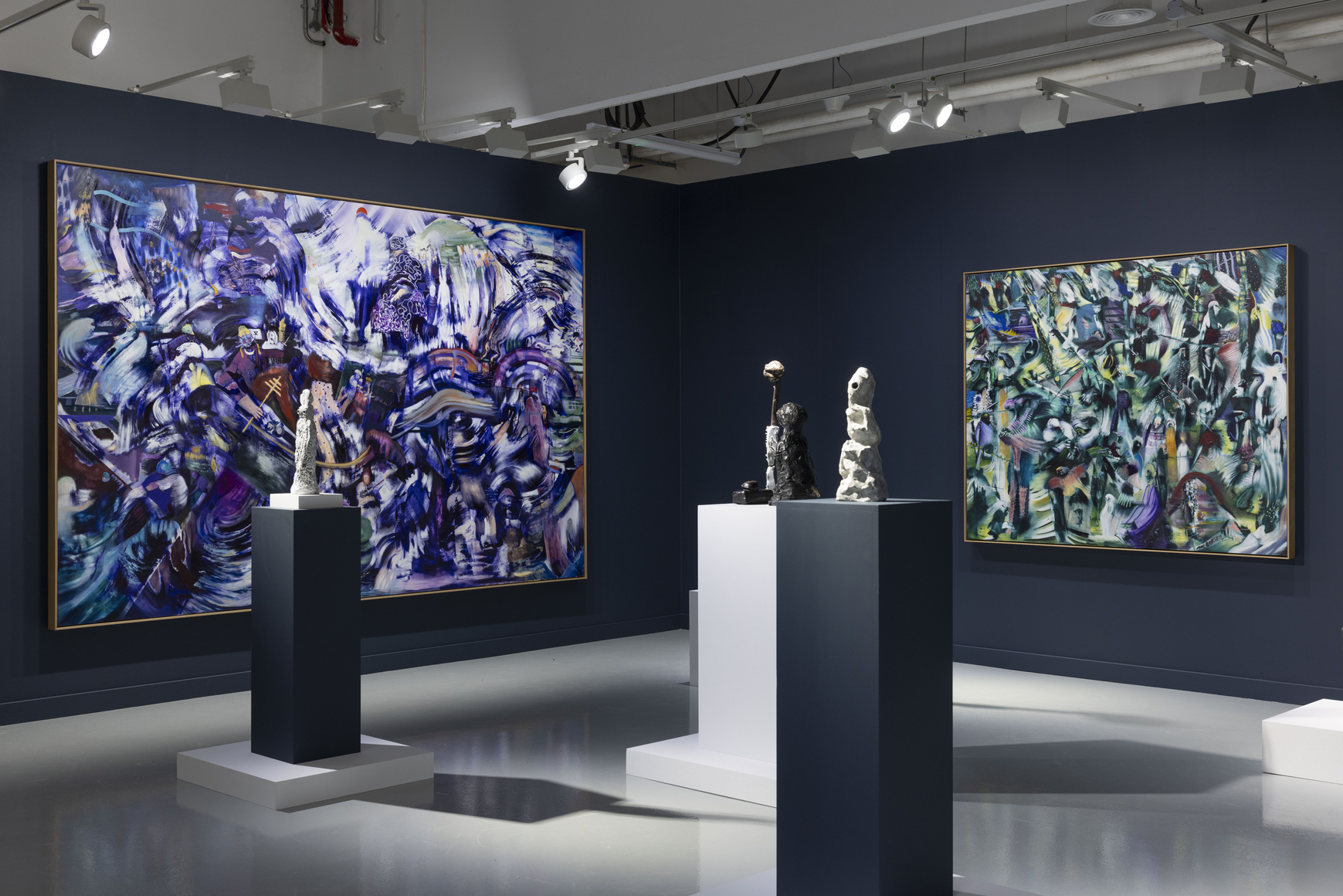 At the center of the exhibition is The Scribe (2026), a large-scale painting depicting a Shakespearean, hybrid figure—half person, half paint—suspended within a hallucinatory space. The work embodies a dual identity Banisadr recognizes in himself: thinker and painter, scholar and dreamer. Historically, the scribe is a preserver of information; here, the role expands. This figure does not merely record but revises, challenges, and extends knowledge. Banisadr’s conception is informed by his long-standing engagement with medieval Islamic polymaths associated with the House of Wisdom in Baghdad—figures such as Averroes, Ibn Sina, and Al-Hazan— whose work translated, corrected, and transformed Greek philosophy through experimentation and inquiry. Algebra, optics, medicine, astronomy, and systems of hospitals emerged not through repetition, but through creative revision. It was this vast, evolving body of knowledge—circulated, contested, and enriched across cultures— that later reentered Europe and became a critical foundation for the Renaissance, a period Banisadr holds in deep regard as a moment when art, science, philosophy, and humanism were once again understood as inseparable pursuits. Transformation in Al-Kīmiyā is also grounded in the natural world. When poets awake, it becomes night (2026) depicts a gathering in a forest under a wolf moon, inspired by an experience hiking with Banisadr’s children through a snowy, nocturnal landscape. The painting began outdoors, its initial marks made with branches directly on canvas. The forest appears as both primordial site and psychic threshold—inhabited by shamanic figures that echo the painter himself. For Banisadr, the forest exists just beyond the boundaries of consciousness: a place where instinct overtakes orientation, yet also the reservoir from which civilization itself is built. Poetry, like painting, becomes a vehicle for expressing what cannot be documented or photographed— phenomena accessible only through lived experience and symbolic form.