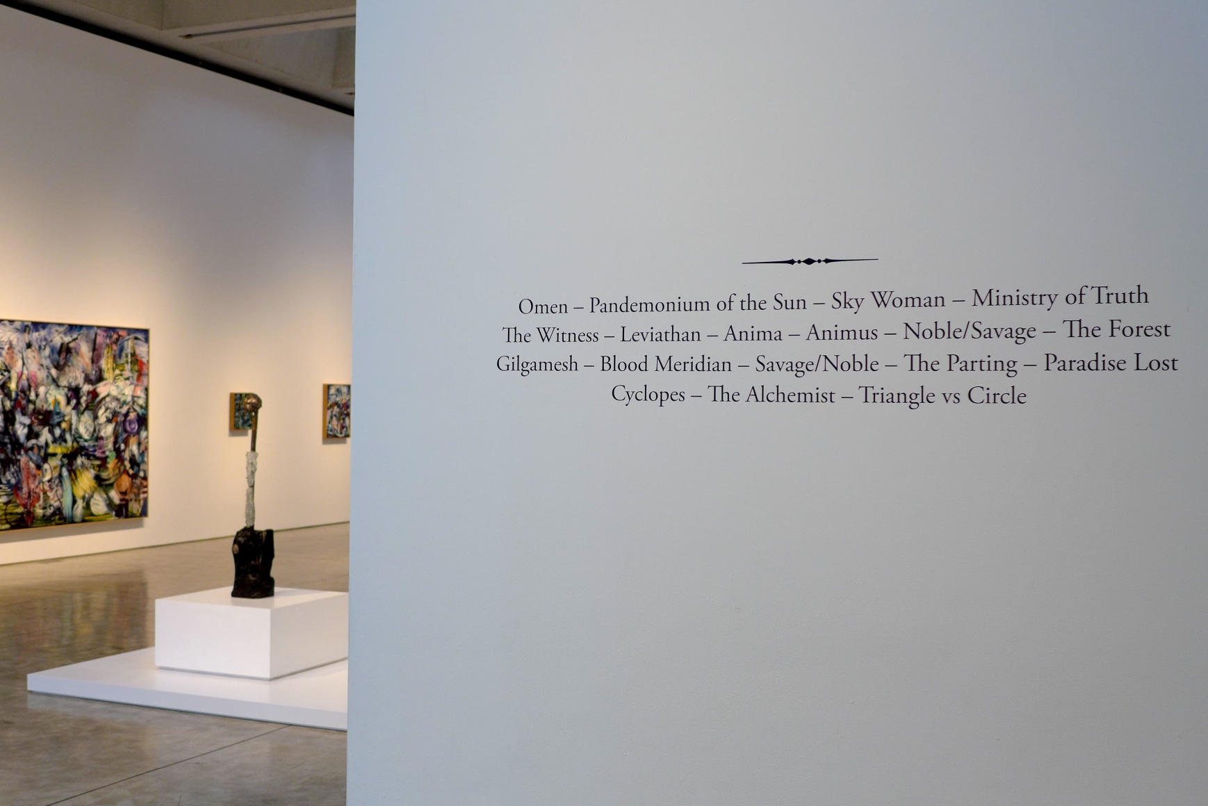 The artist often frames his work through transformative encounters from literary epics and other texts – Gilgamesh meeting Enkidu, Rumi meeting Shams, Apollo and Dionysus, or the rational self meeting the wild inner other in Jung's archetype of Anima and Animus. These encounters destabilize one world and open a passage into another. They embody what W. B. Yeats once called a "terrible beauty" - moments of rupture that generate new realities.