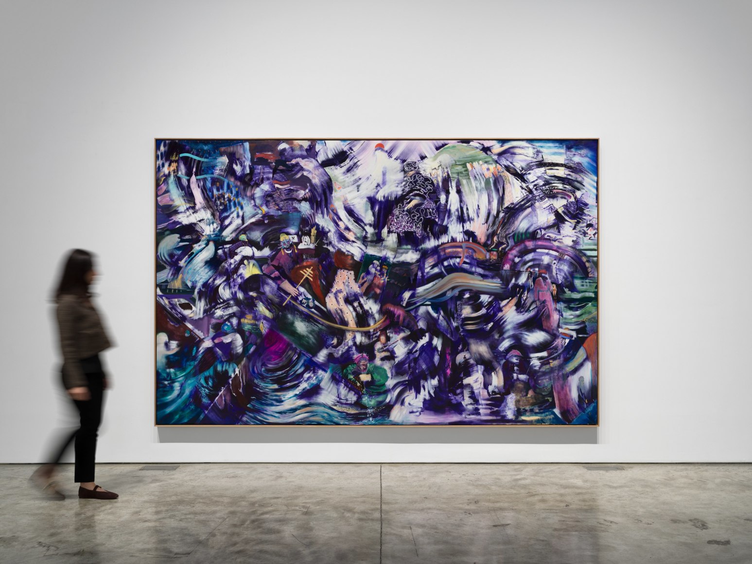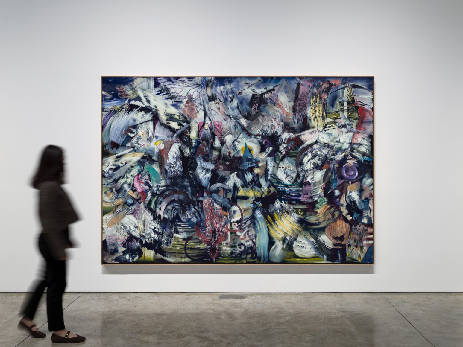 These themes of convergence and simultaneity are reflected in the artist's process. Banisadr is a synesthete who engages multiple senses while at work, resulting in dynamic compositions influenced by the conflation of sound, color and form. The artist's preliminary layers of action painting guide the placement of figurative elements - human bodies, hybrid creatures, and emblems - as exquisite details that develop both pictorial and narrative depth. Banisadr has observed, "As contemporary artists, we live in a storm of images. The speed, saturation, and manipulation of visual culture today functions as a kind of social control-our senses constantly bombarded, our capacity for quiet perception eroded. As a painter, I feel this pressure daily. My studio becomes both a shelter and a decoding space, a place where I can try to make sense of the onslaught."