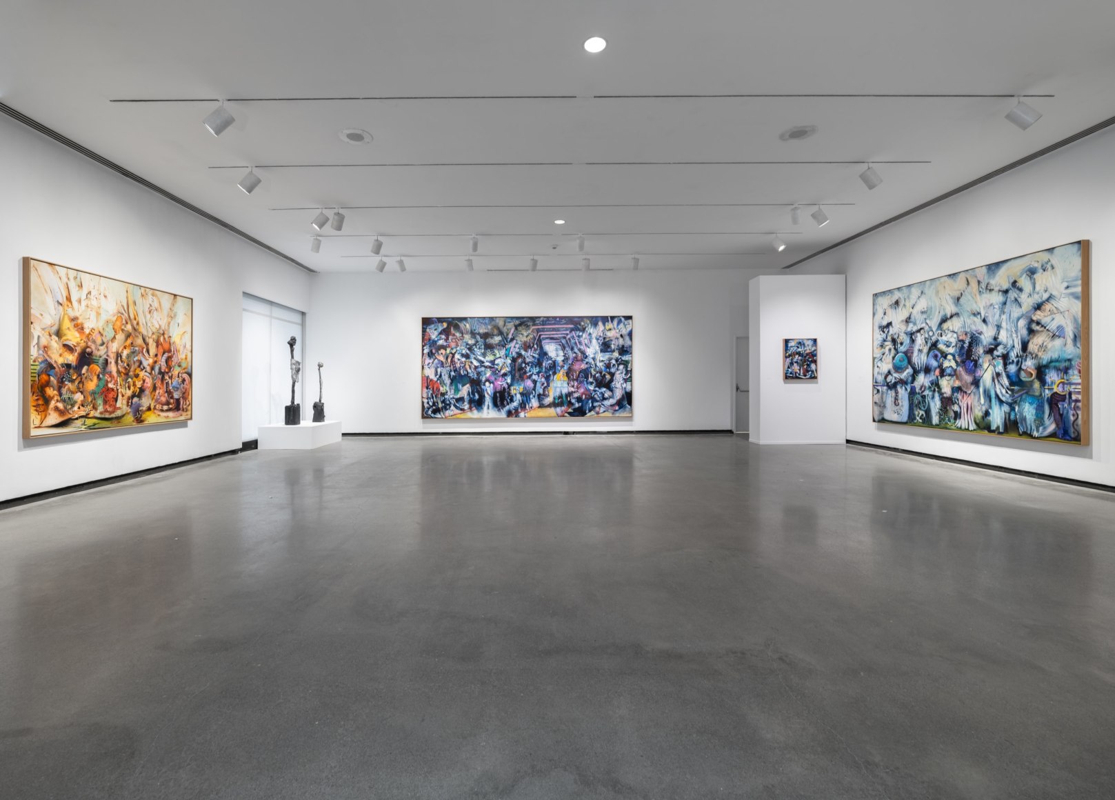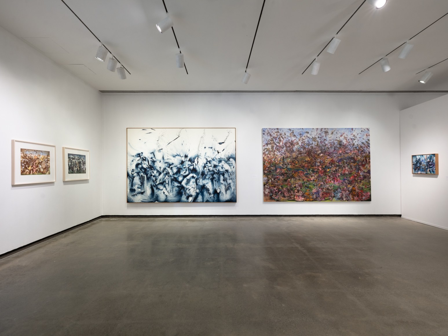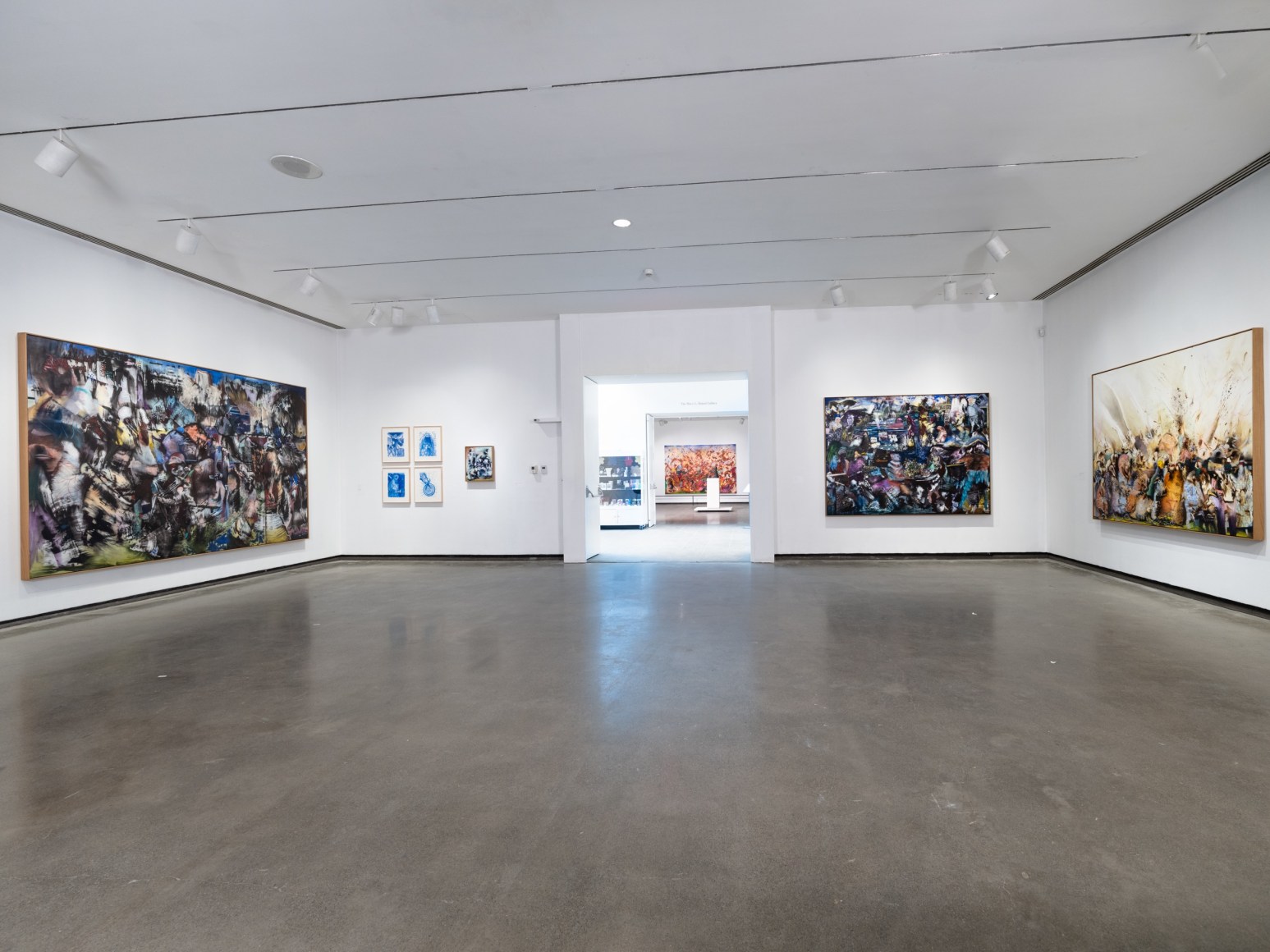 Ali Banisadr’s biographical history growing up amidst revolution and political unrest in Iran, his emigration to the U.S., and wide-ranging artistic influences exemplify the shifting definition of what it means to be an “American artist” today. The personal and artistic narratives across his oeuvre, distilled through a dazzling mastery of art history, philosophy, and world events, offer a nuanced perspective on human nature. Banisadr is a creator of worlds—intuitively and painstakingly constructed—that exude a vitality at once turbulent and revelatory. These microcosms are the culmination of a careful balancing act between chaos and composure, abstraction and representation. Expansive compositions are rich with figurative allusions, sonic recollection filtered through the artist’s synesthesia, invented stories, world history, collective memory, and mythology. The works’ syncopated rhythms echo a multitude of references across the history of