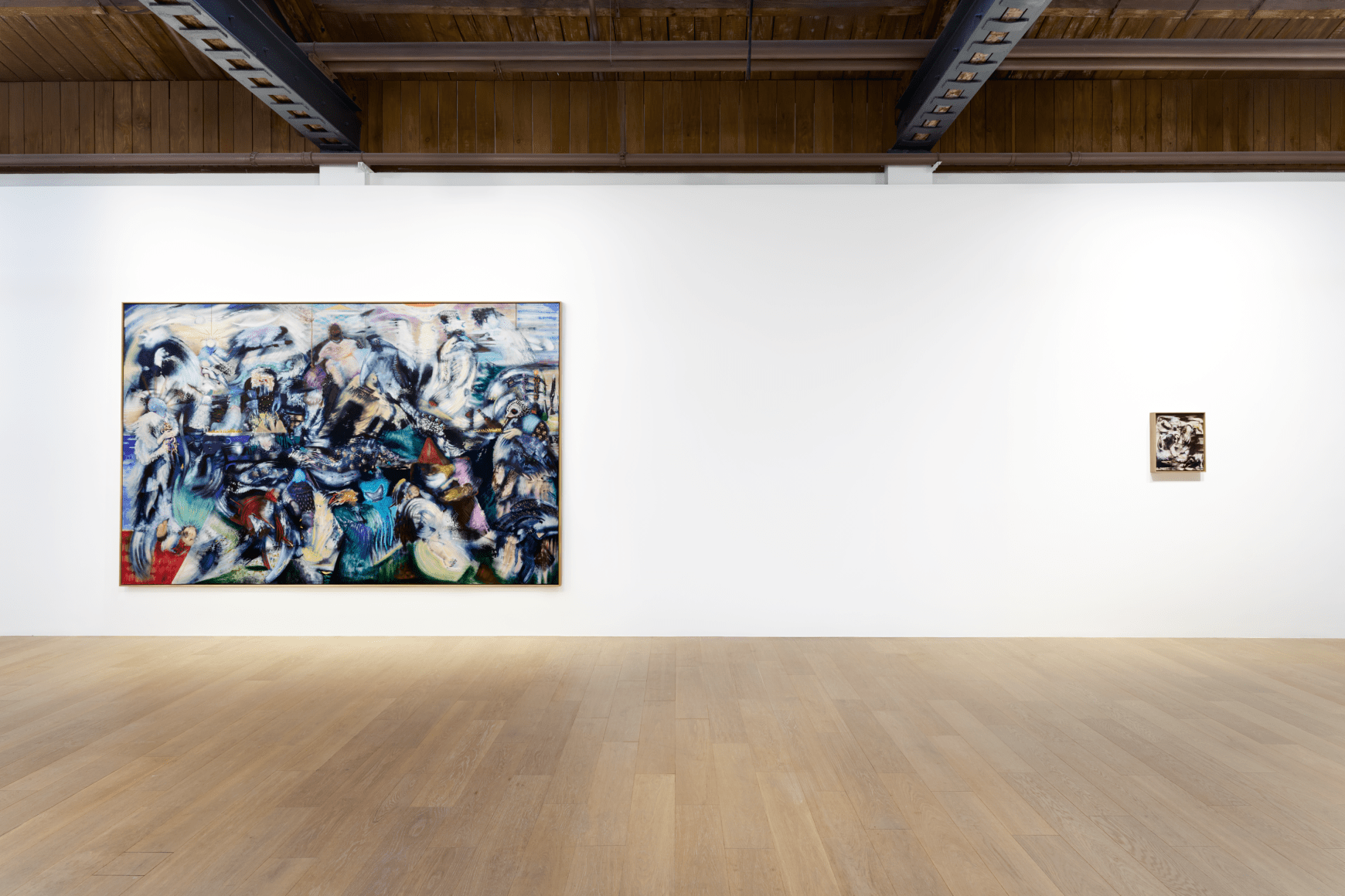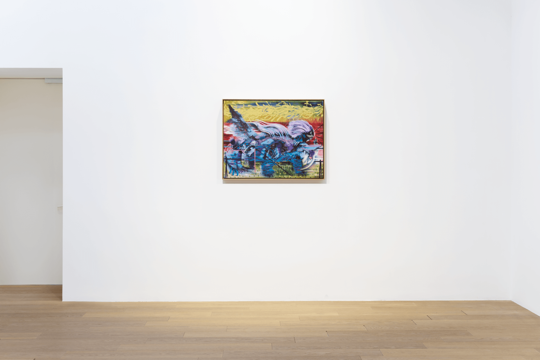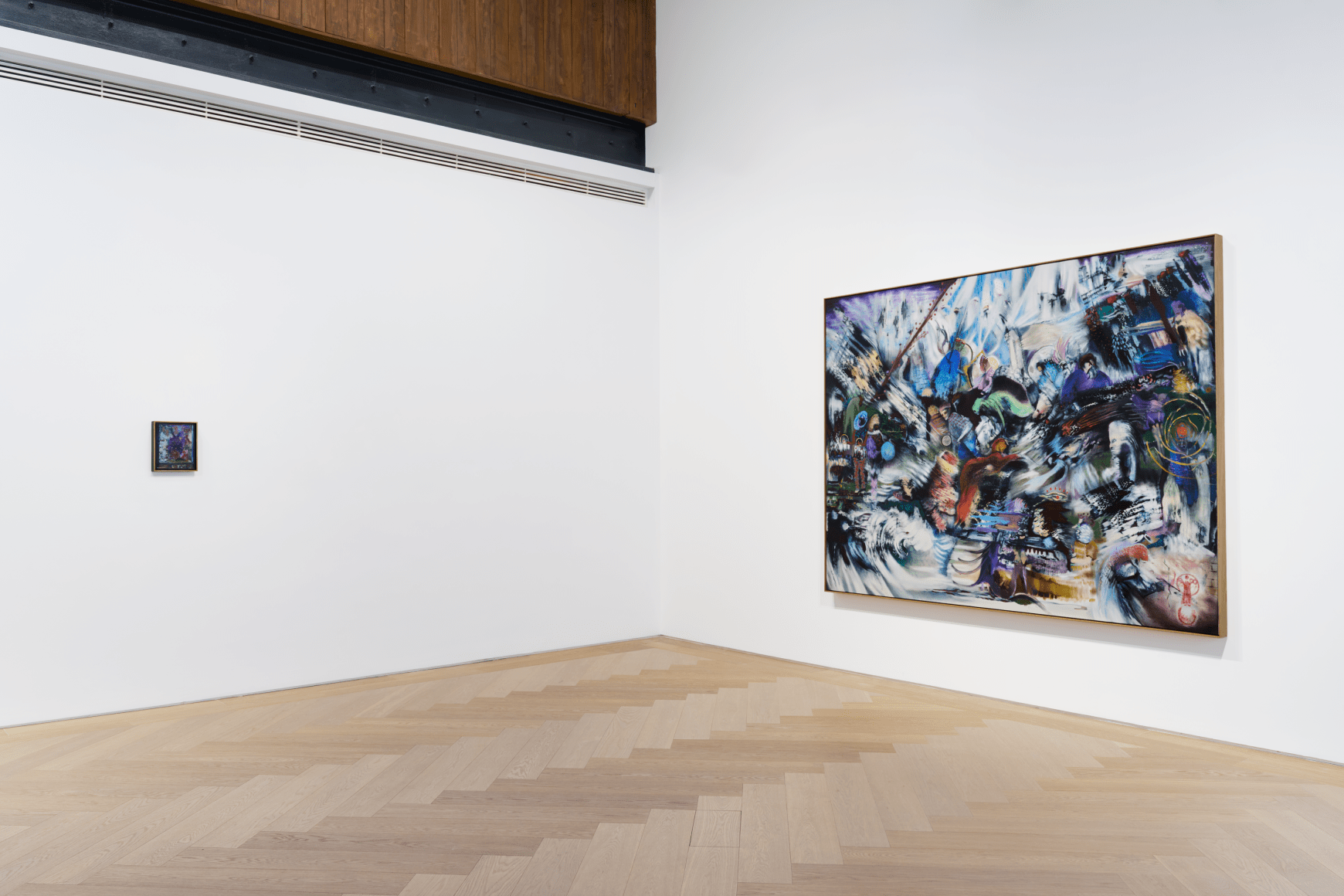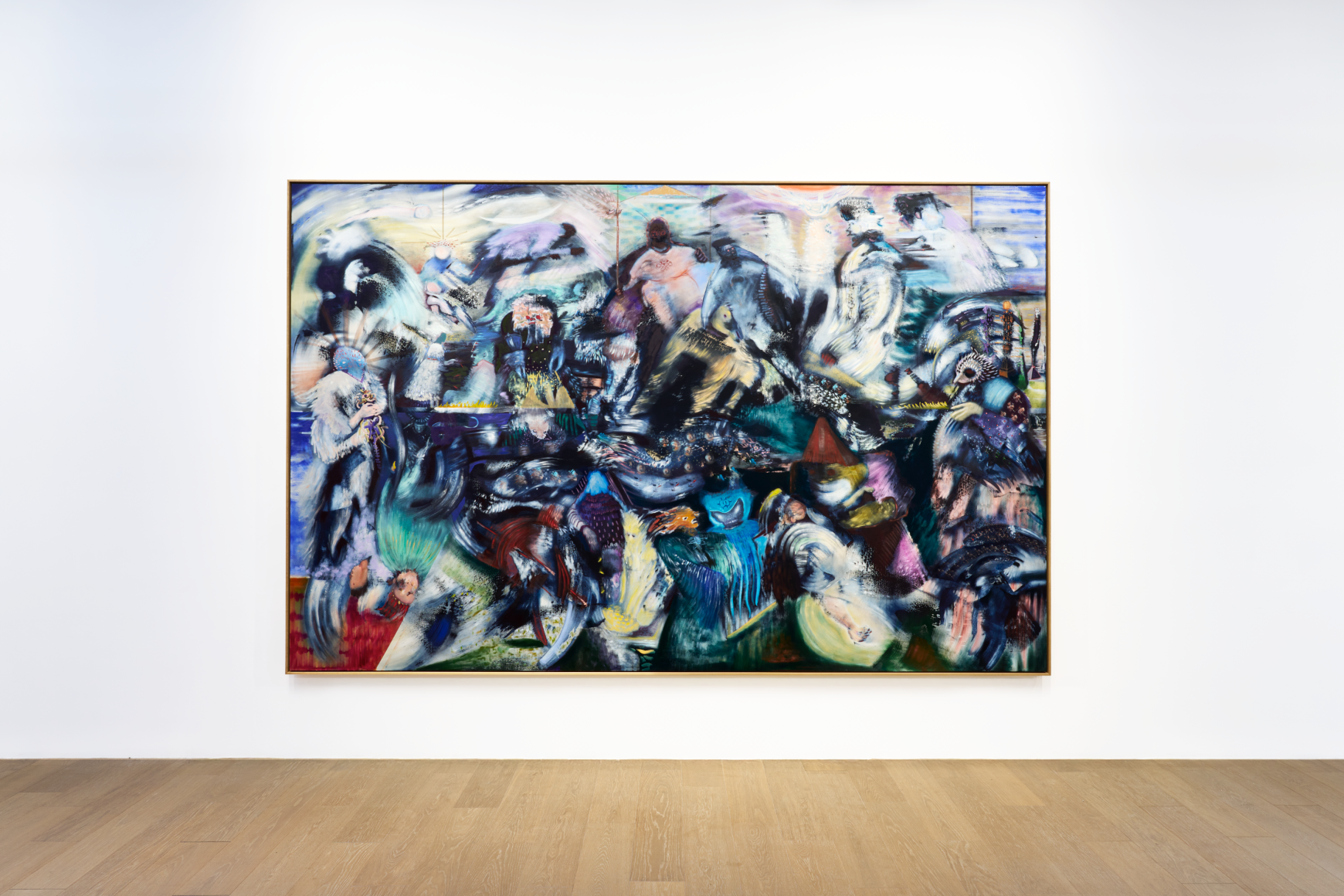 Banisadr’s characters are related to the extraterrestrial beings encountered in science fiction, heroes and wizards in epic quest novels, medieval bestiaries, the ghoulish creatures that Matthias Grünewald depicted in the Isenheim Altarpiece (1512-1516), and illustrated alchemical texts, just to name some of his inspirations. However, while resolution is common to many of these works, Banisadr’s figures inhabit a turbulent, alternate world in which resolution and redemption are noticeably absent.In the 11 paintings that constitute Banisadr’s debut exhibition in China, the viewer is invited to enter cacophonous worlds and shadowy domains. Most of the paintings can be divided into two groups, with The Painting (2020 - 2024) being the exception. Each group tends to be the same size, with the smaller paintings sharing the same moody blue palette. Within each group, however thematically connected, each painting is as unique as the planets in our solar system.