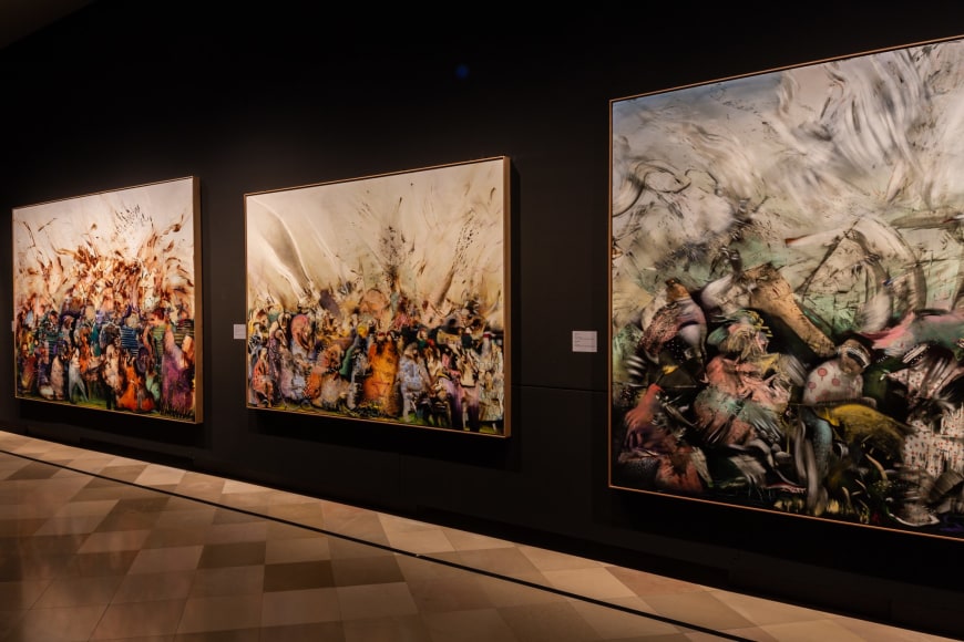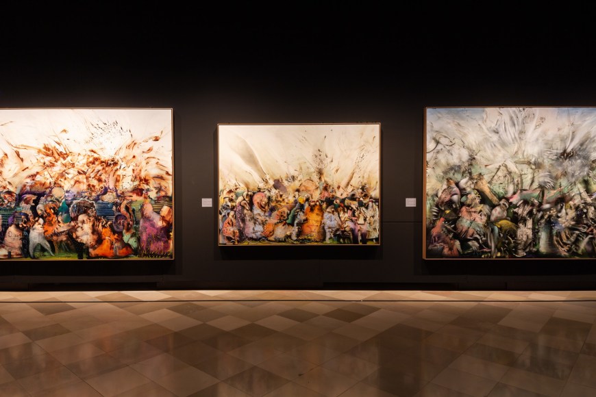 Born in Tehran, Iran in 1976, Ali Banisadr moved to the USA with his family as a child. In 2000, he began his studies at the School of Visual Arts in New York, the city where he still lives and works. His large-scale, complex paintings oscillate between figuration and Abstract Expressionism. The artist has been inspired by Old Masters such as Bosch and Bruegel as well as Max Beckmann and Wassily Kandinsky. Unlike his earlier work, direct references to art history are vague and Banisadr has discovered his own artistic form of expression. His dynamic brushwork and the variety of forms and figures generate compositions that frequently reflect a chaotic world. The paintings are reminiscent of explosions; it is unclear whether the movement in the images flow from the top down or the bottom up. Sound and music are integral to his work and influence the way he creates.