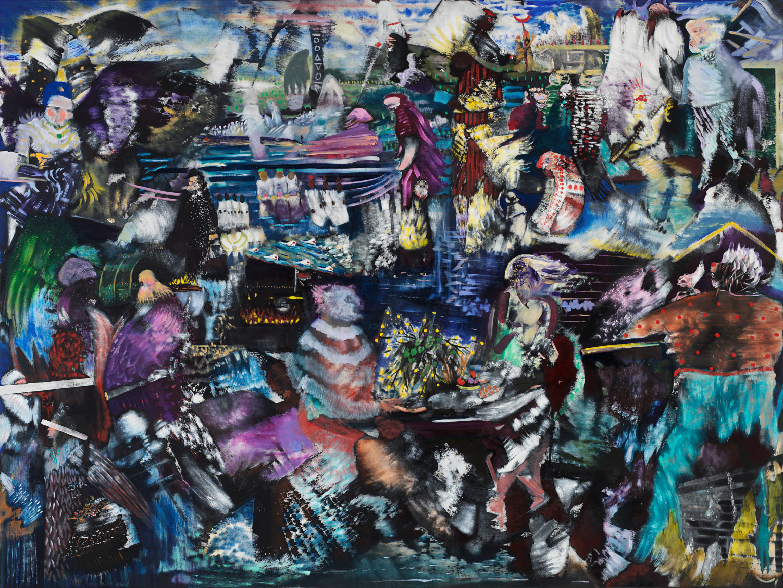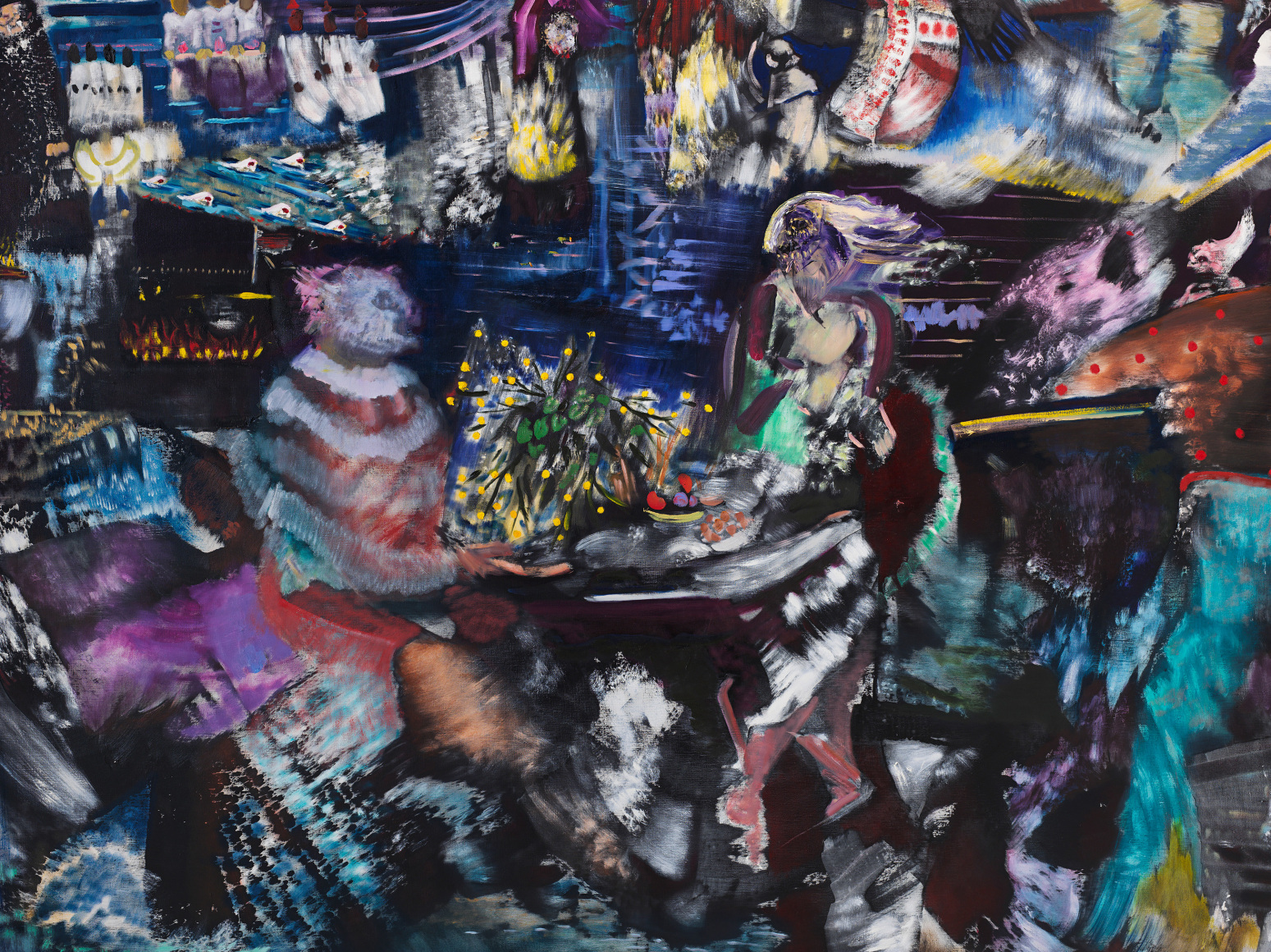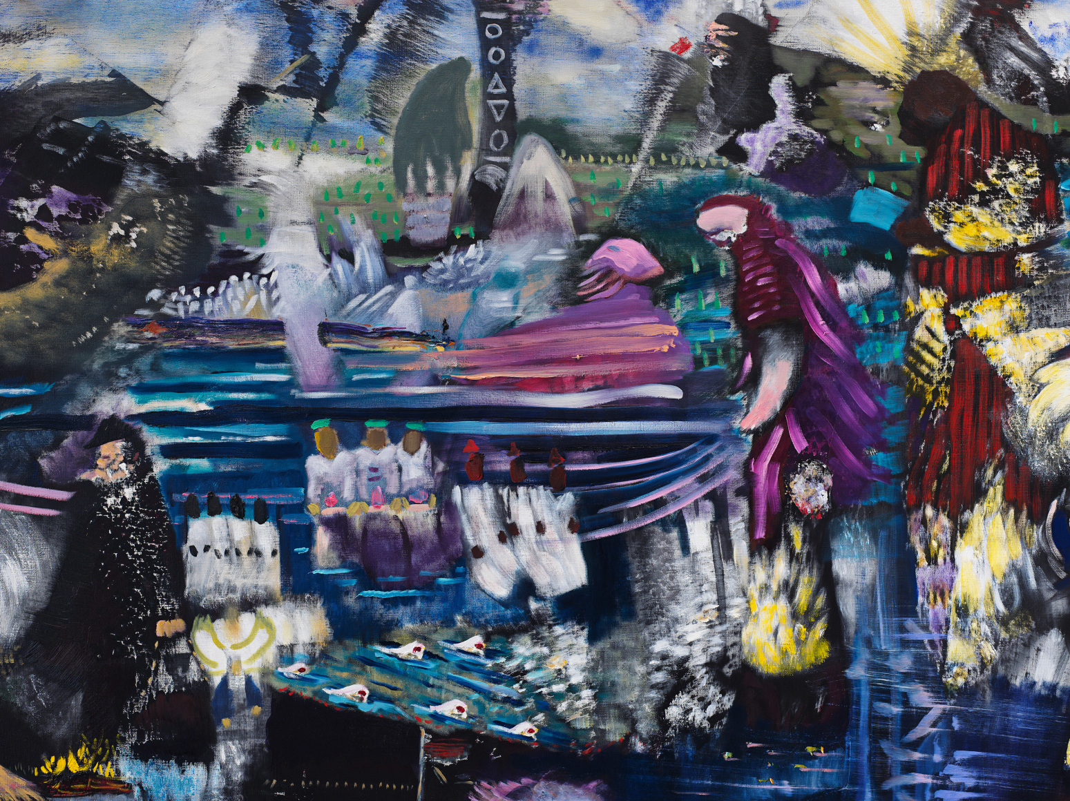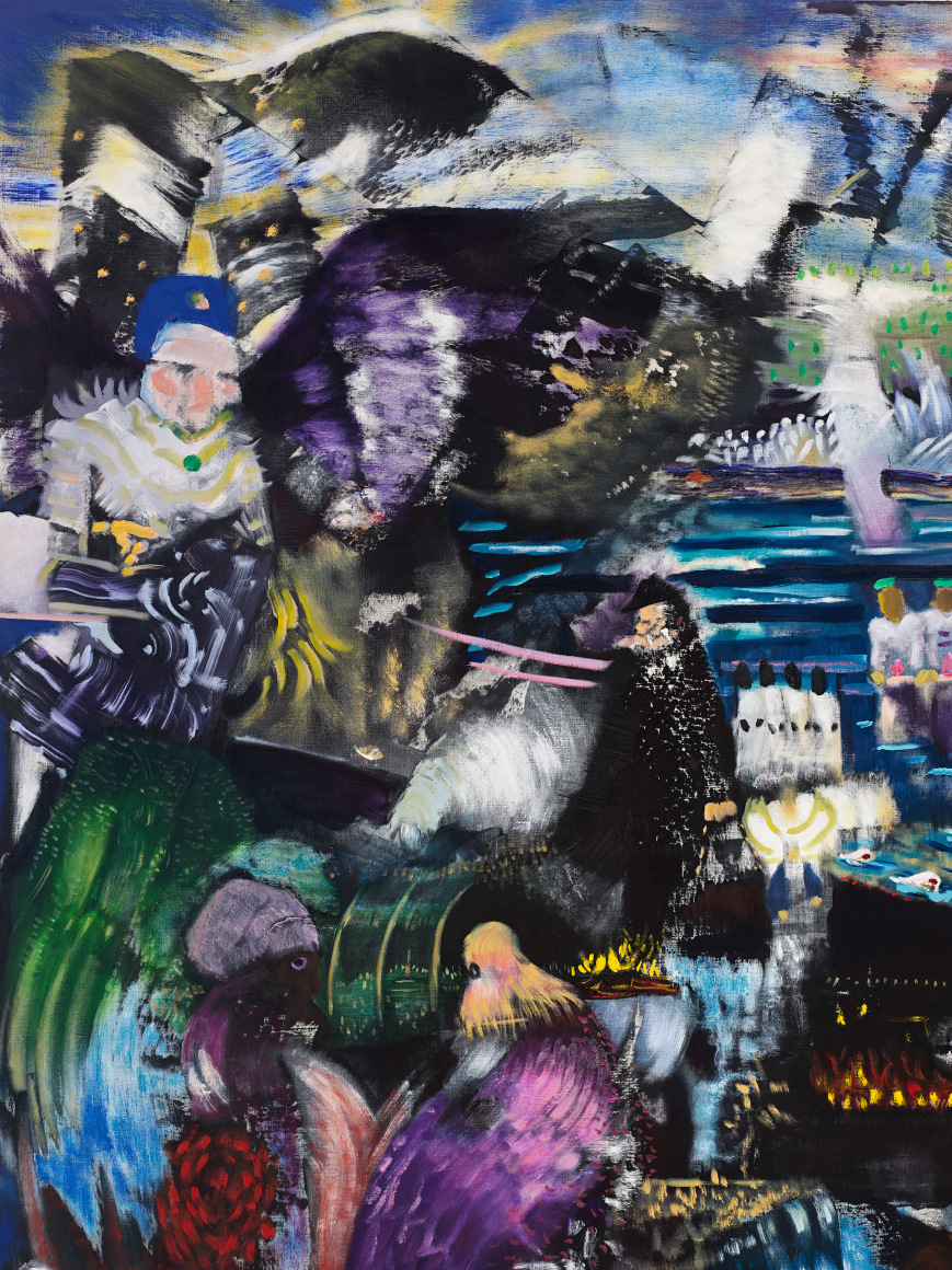 What is the cat-like creature , who is seated at the table in the lower center of the painting Still-Life (2024) doing? Look carefully at the illuminated plant-like form on the table in front of him, and you will see that it is made of linear elements and abstract shapes such as a circle, a sign of the artist’s deft mastery. Both creatures seem oblivious to the world around them. Above them we see other creatures going about their business. Animals wander about. In the distance, we see banners, which suggest unseen armies on the move. The more the viewer discerns, the stranger and more compelling the painting becomes.