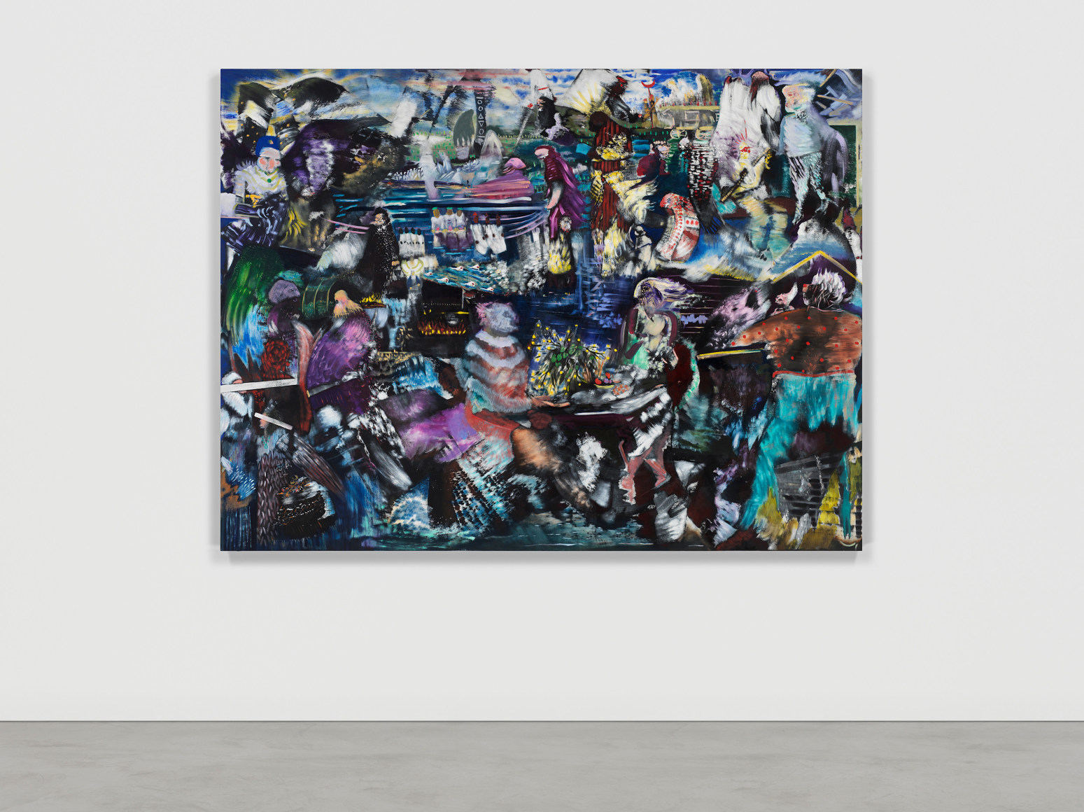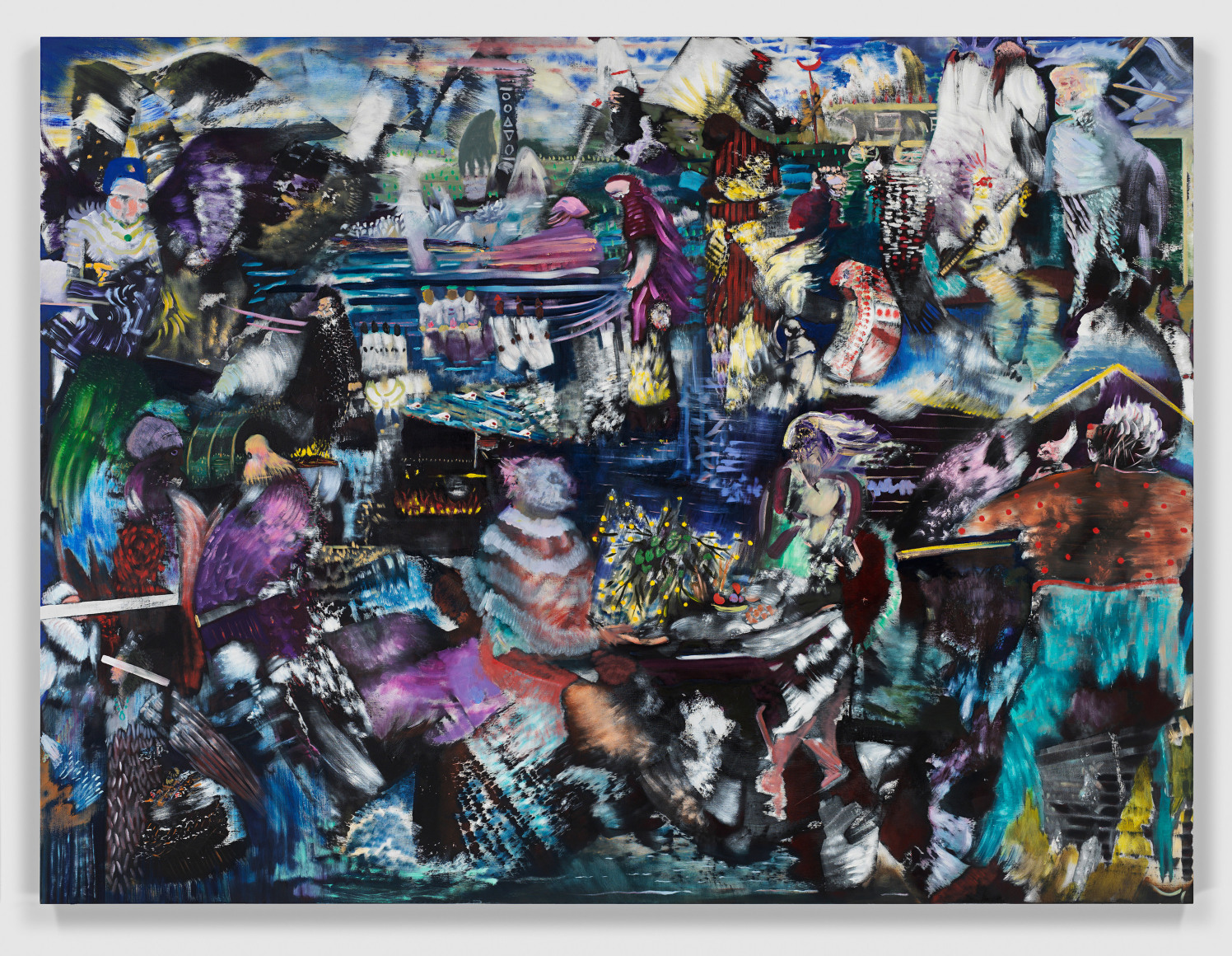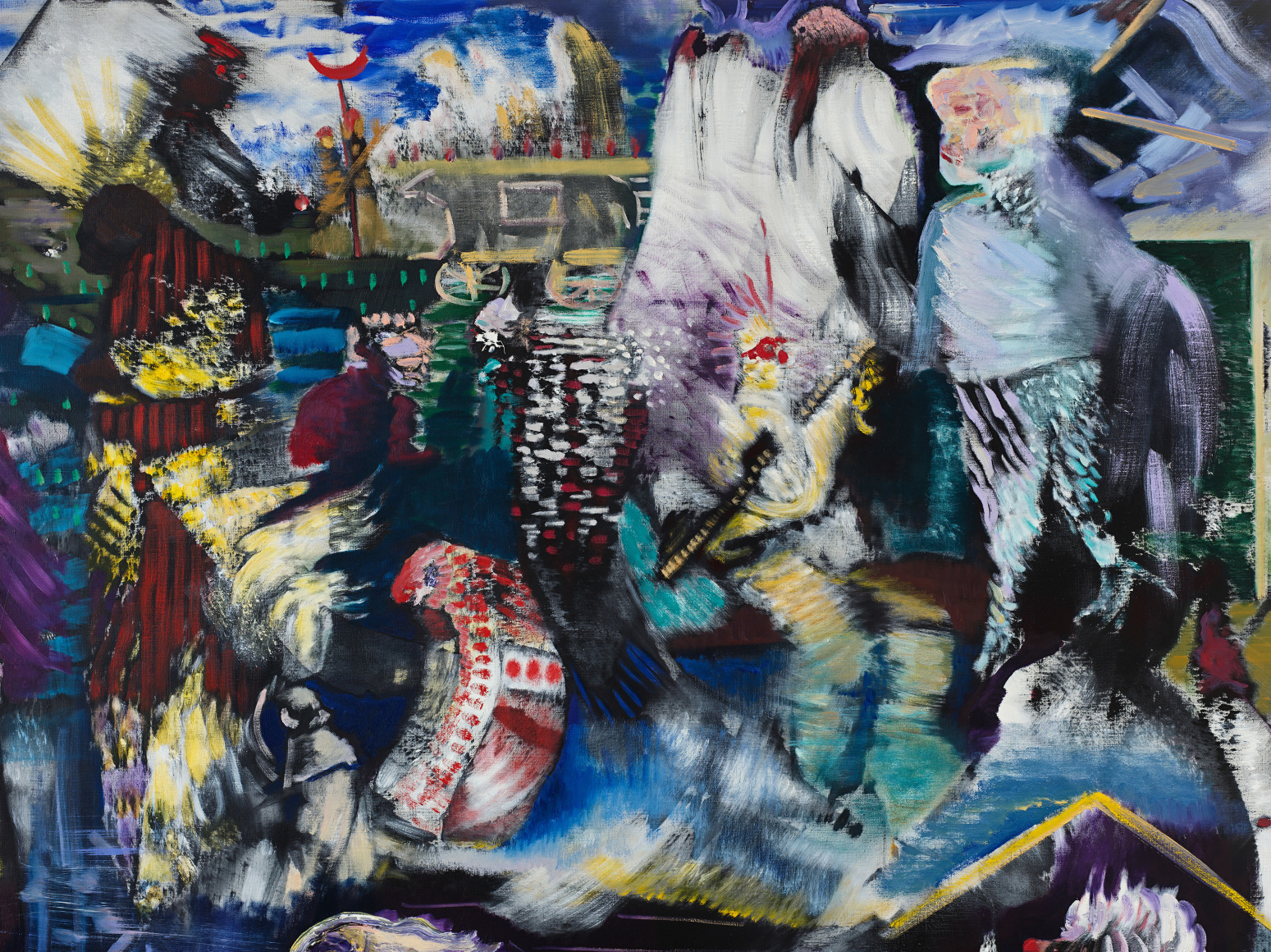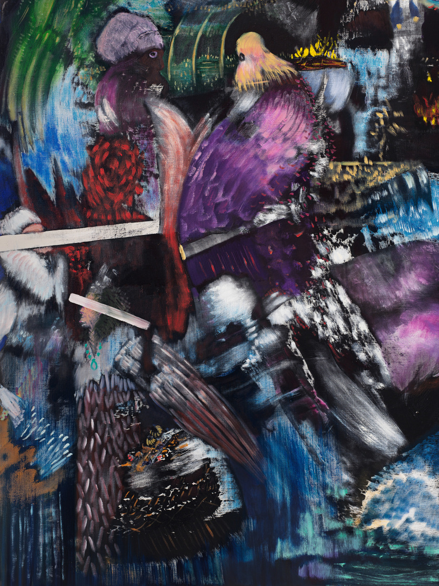 What is the cat-like creature , who is seated at the table in the lower center of the painting Still-Life (2024) doing? Look carefully at the illuminated plant-like form on the table in front of him, and you will see that it is made of linear elements and abstract shapes such as a circle, a sign of the artist’s deft mastery. Both creatures seem oblivious to the world around them. Above them we see other creatures going about their business. Animals wander about. In the distance, we see banners, which suggest unseen armies on the move. The more the viewer discerns, the stranger and more compelling the painting becomes.