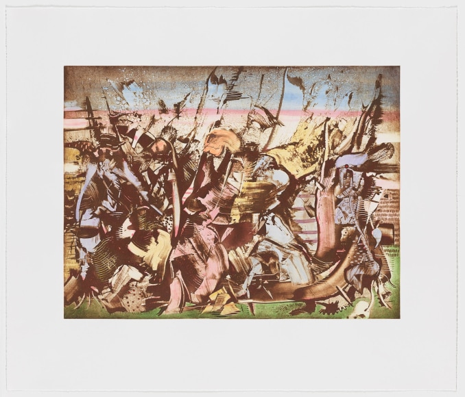 "Cannons Hidden in Roses", 2019, Hand-coloured Watercolor, aquatint, Etching, spitbite, drypoint and burnishing on Hahnemuhle Copperplate Bright White 300 gsm Paper 68.0 x 80.0 cm / Image 48.3 x 63.5 cm Paper 26 ¾ x 31 ½ inches / Image 19 x 25 inches